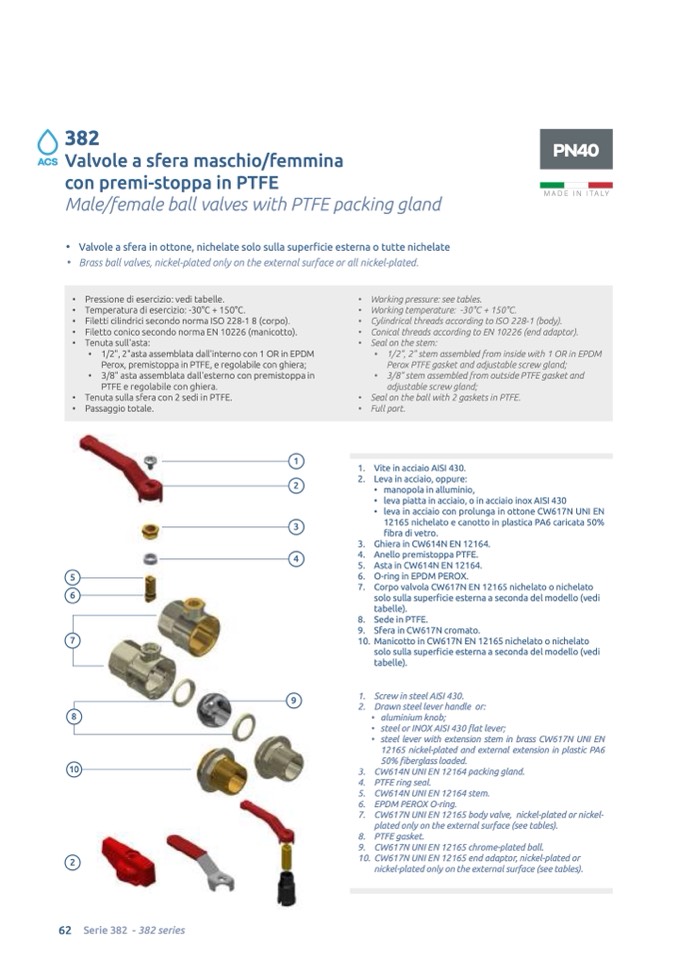 • Tenuta sulla sfera con 2 sedi in PTFE.