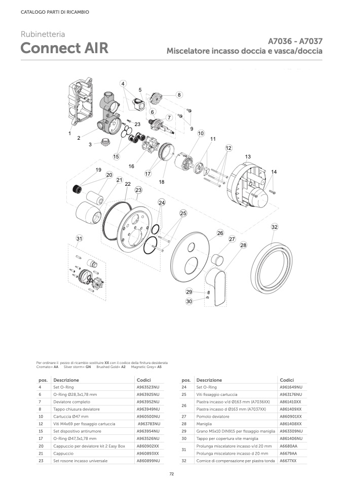 Per ordinare il pezzo di ricambio sostituire XX con il codice della finitura desiderata