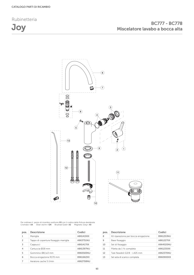 Per ordinare il pezzo di ricambio sostituire XX con il codice della finitura desiderata