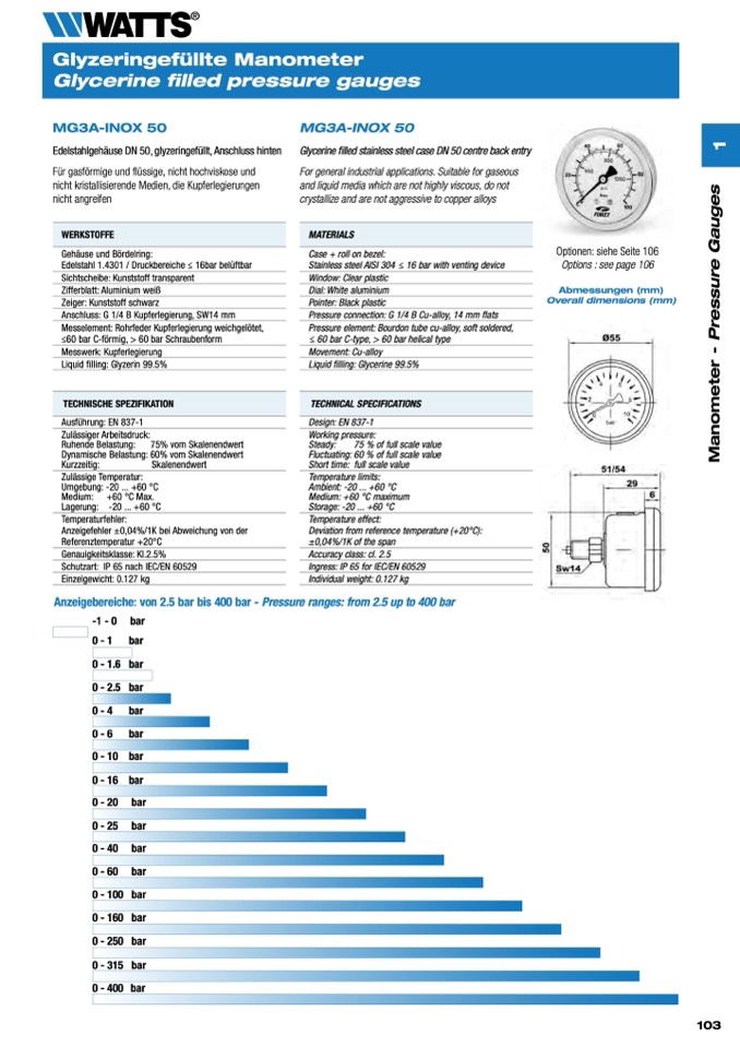 Anzeigebereiche: von 2.5 bar bis 400 bar - Pressure ranges: from 2.5 up to 400 bar