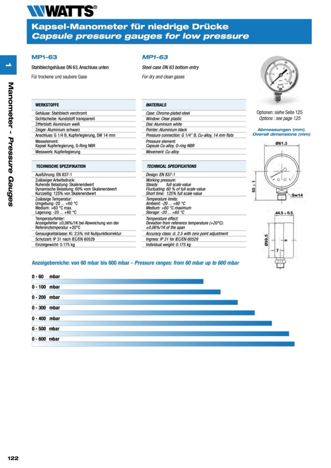 Anzeigebereiche: von 60 mbar bis 600 mbar - Pressure ranges: from 60 mbar up to 600 mbar