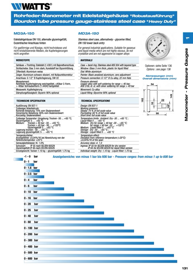Anzeigebereiche: von minus 1 bar bis 600 bar - Pressure ranges: from minus 1 up to 600 bar