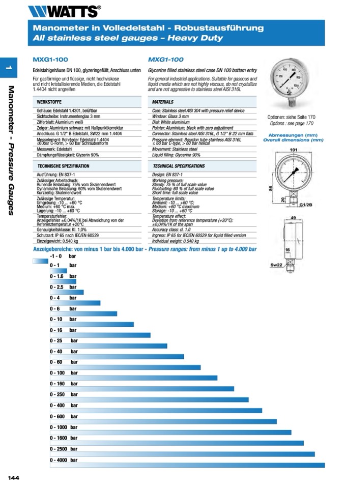 Anzeigebereiche: von minus 1 bar bis 4.000 bar - Pressure ranges: from minus 1 up to 4.000 bar