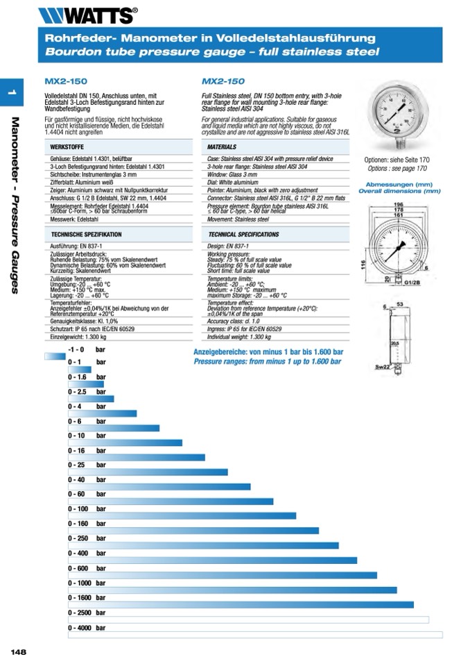 Anzeigebereiche: von minus 1 bar bis 1.600 bar