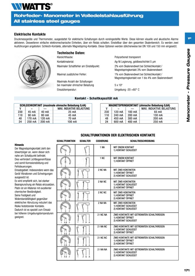 Druckmessgeräte und Thermometer, ausgestattet für elektrische Schaltungen durch voreingestellte Werte. Diese können visuelle und akustische Alarme