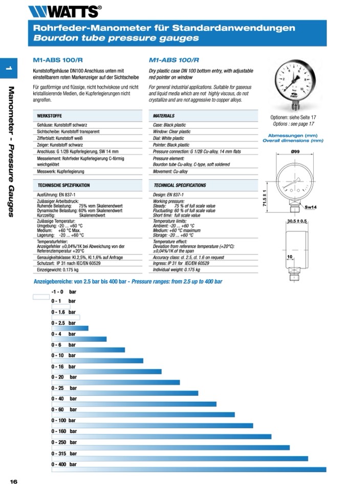 Anzeigebereiche: von 2.5 bar bis 400 bar - Pressure ranges: from 2.5 up to 400 bar
