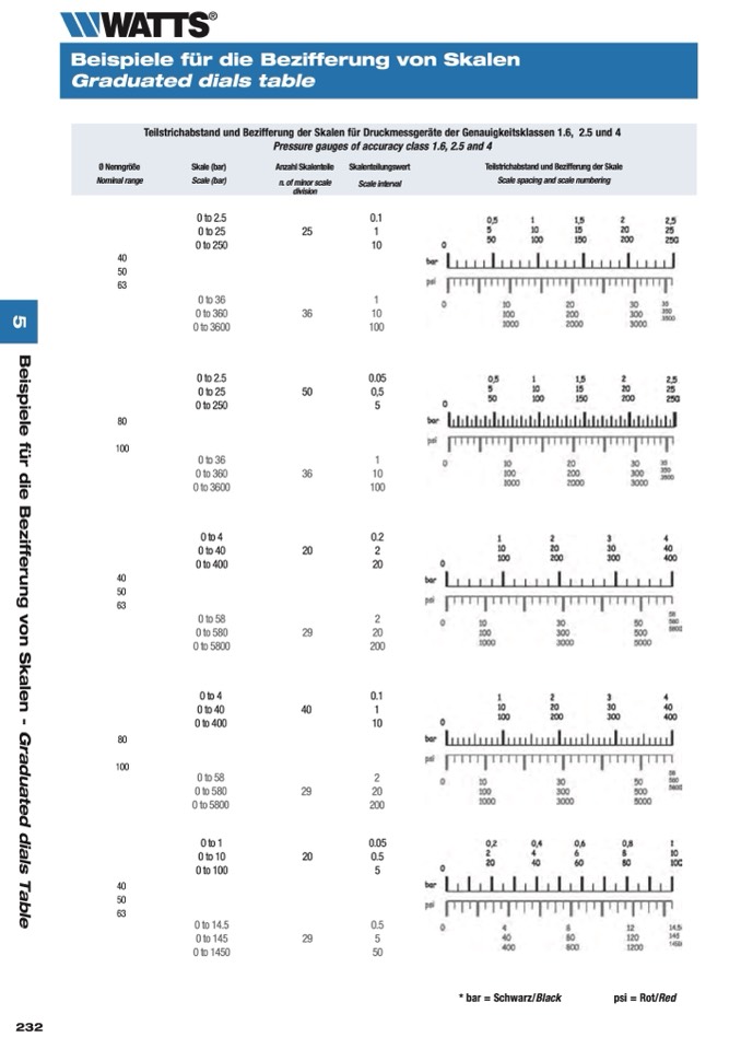 Teilstrichabstand und Bezifferung der Skalen für Druckmessgeräte der Genauigkeitsklassen 1.6, 2.5 und 4