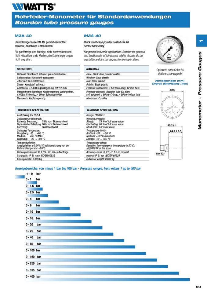 Anzeigebereiche: von minus 1 bar bis 400 bar - Pressure ranges: from minus 1 up to 400 bar