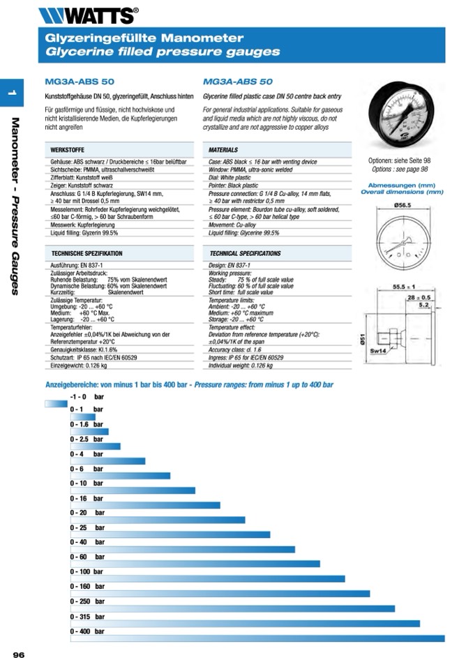 Anzeigebereiche: von minus 1 bar bis 400 bar - Pressure ranges: from minus 1 up to 400 bar