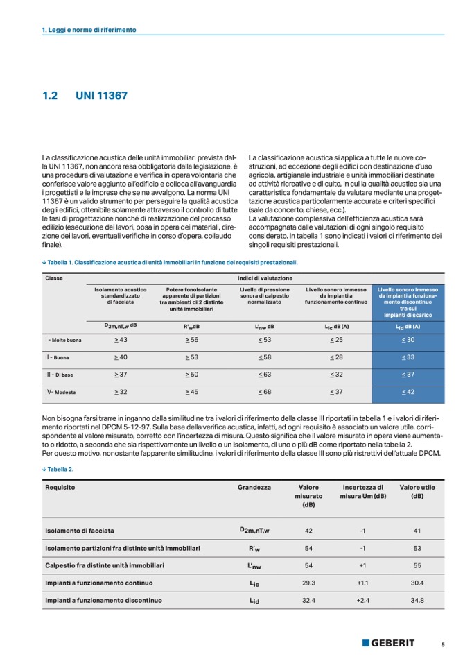↓ Tabella 1. Classificazione acustica di unità immobiliari in funzione dei requisiti prestazionali.
