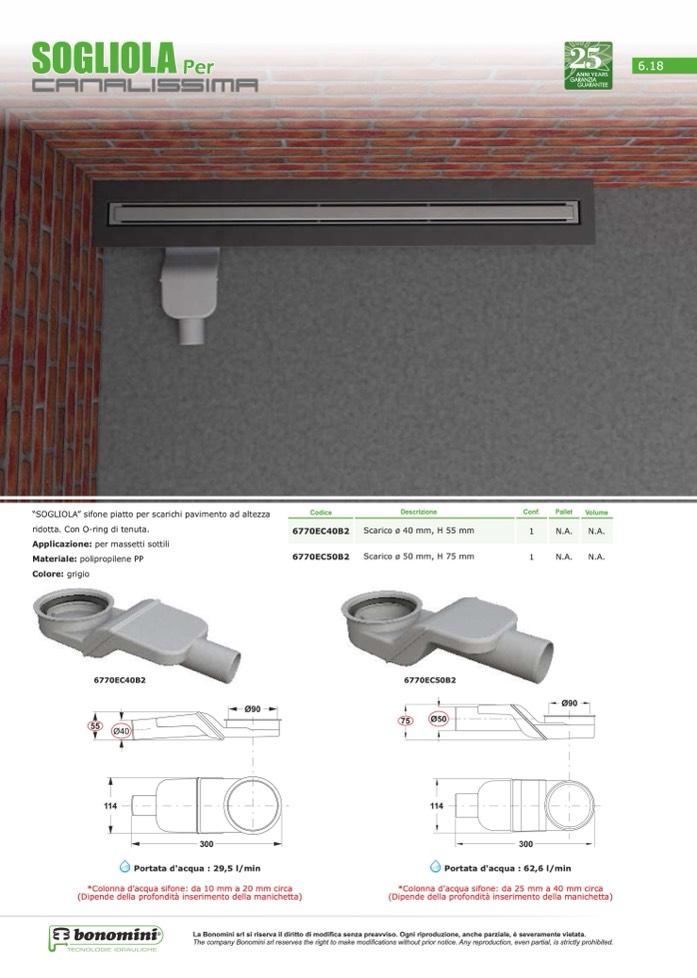 “SOGLIOLA” sifone piatto per scarichi pavimento ad altezza