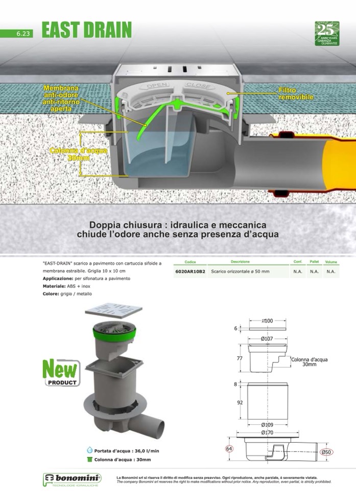 "EAST-DRAIN" scarico a pavimento con cartuccia sifoide a