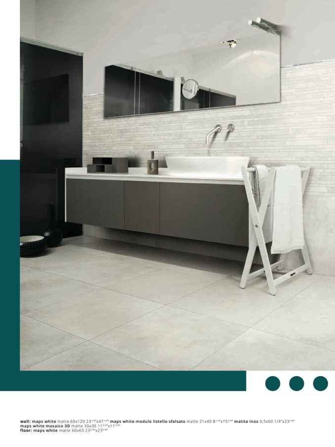 wall: maps white matte 60x120 235/8”x471/4” maps white modulo listello sfalsato matte 21x40 81/4”x153/4” matita inox 0,5x60 1/4”x235/8