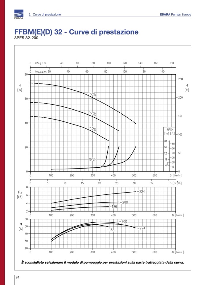 È sconsigliato selezionare il modulo di pompaggio per prestazioni sulla parte tratteggiata della curva.
