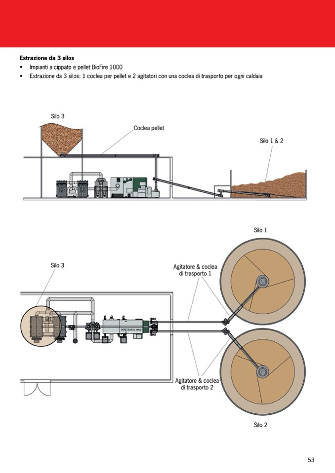 • Estrazione da 3 silos: 1 coclea per pellet e 2 agitatori con una coclea di trasporto per ogni caldaia