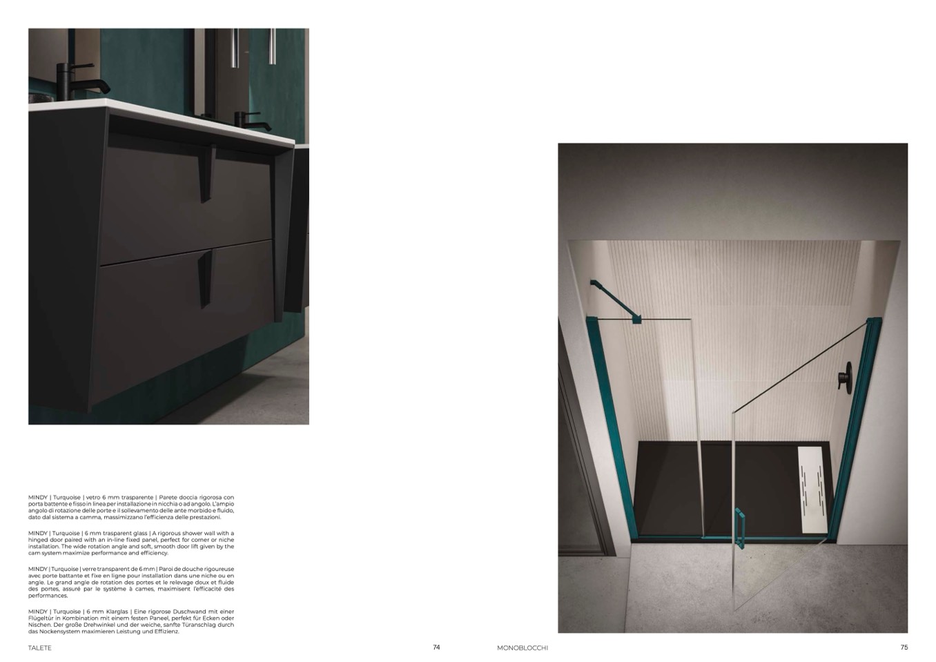 MINDY | Turquoise | 6 mm trasparent glass | A rigorous shower wall with a