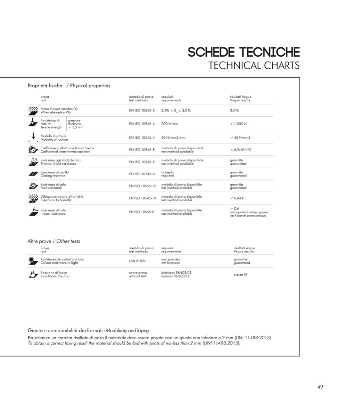 Per ottenere un corretto risultato di posa il materiale deve essere posato con un giunto non inferiore a 2 mm (UNI 11493:2013).