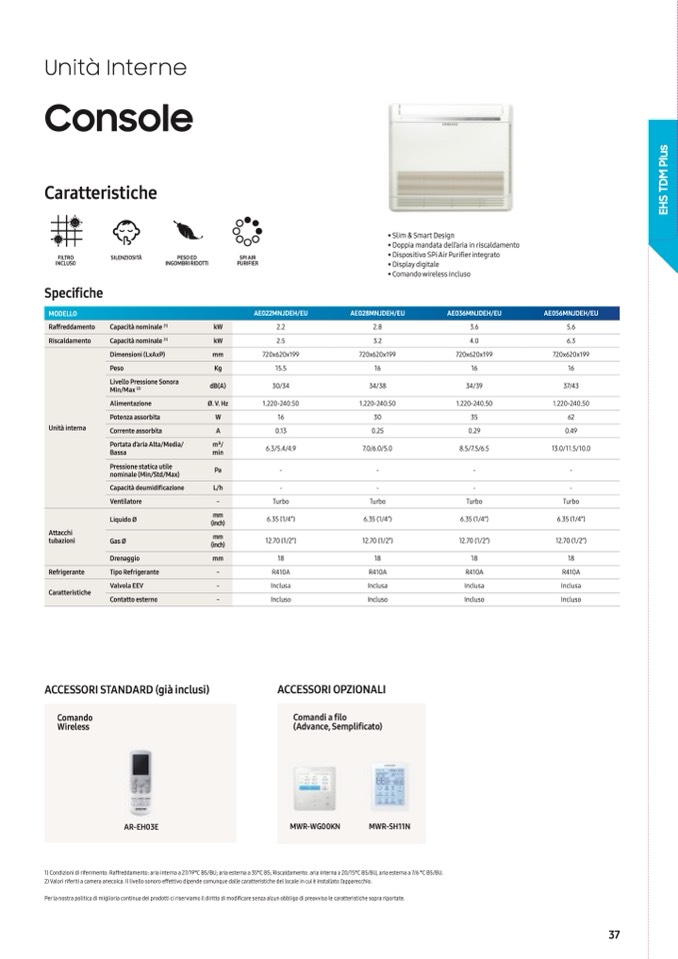 1) Condizioni di riferimento: Raffreddamento: aria interna a 27/19°C BS/BU; aria esterna a 35°C BS; Riscaldamento: aria interna a 20/15°C BS/BU, aria esterna a 7/6 °C BS/BU.