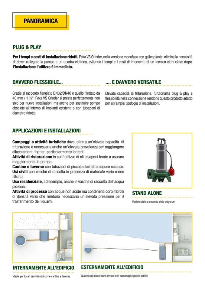 Per i tempi e costi di installazione ridotti. Feka VS Grinder, nella versione monofase con galleggiante, elimina la necessità