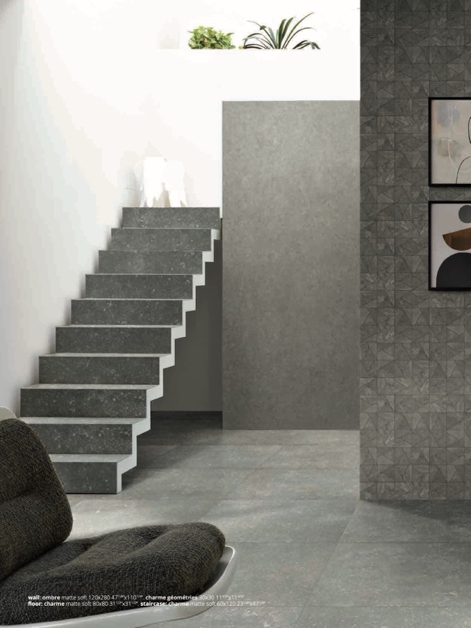 floor: charme matte soft 80x80 311/2”x311/2”. staircase: charme matte soft 60x120 235/8”x471/4”
