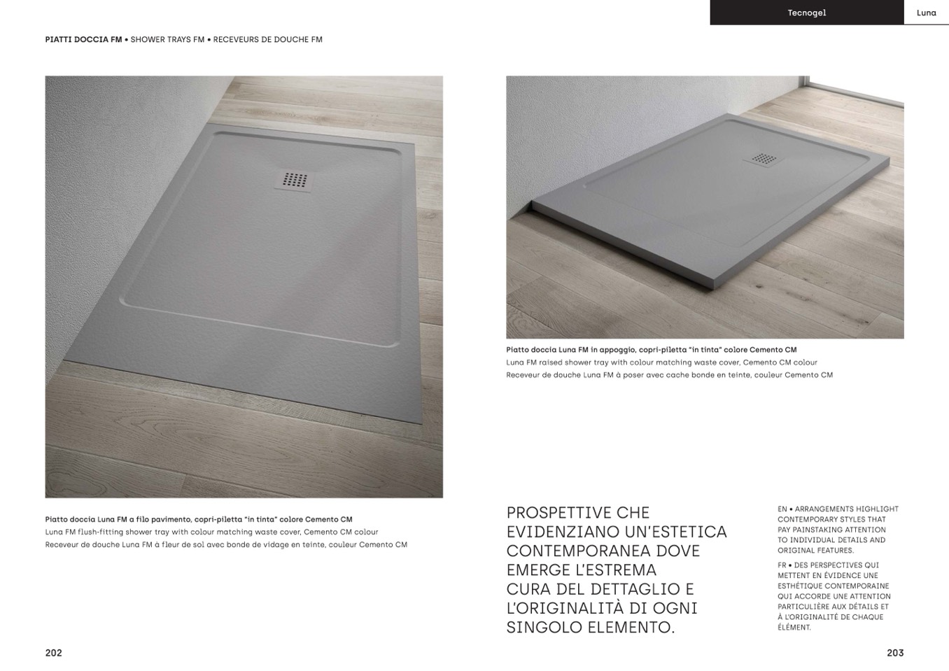 Piatto doccia Luna FM a filo pavimento, copri-piletta “in tinta” colore Cemento CM