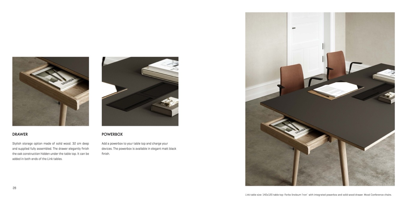Link table size: 140x120 table top: Forbo linoleum ’Iron’ with integrated powerbox and solid wood drawer. Mood Conference chairs.