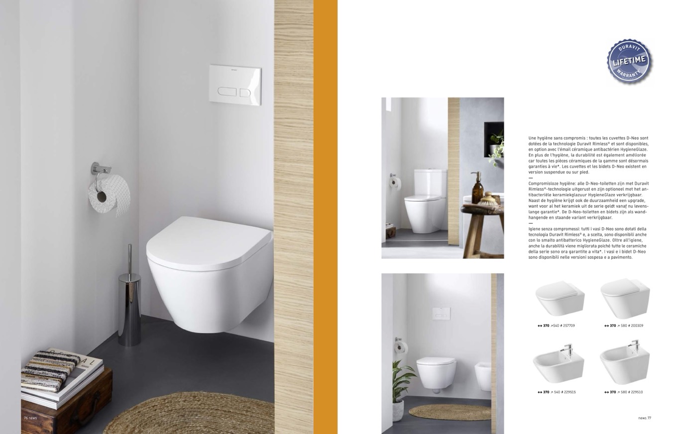l—ange garantie*. De D-Neo-toiletten en bidets zijn als wand-