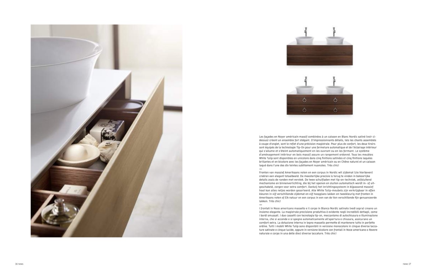 Les façades en Noyer américain massif combinées à un caisson en Blanc Nordic satiné (voir ci-