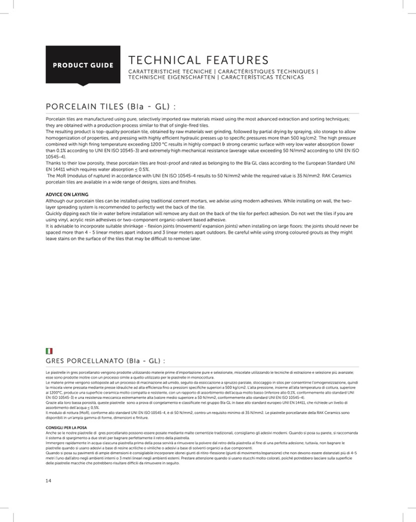 Il modulo di rottura (MoR), conforme allo standard UNI EN ISO 10545-4, è di 50 N/mm2, contro un requisito minimo di 35 N/mm2. Le piastrelle porcellanate della RAK Ceramics sono