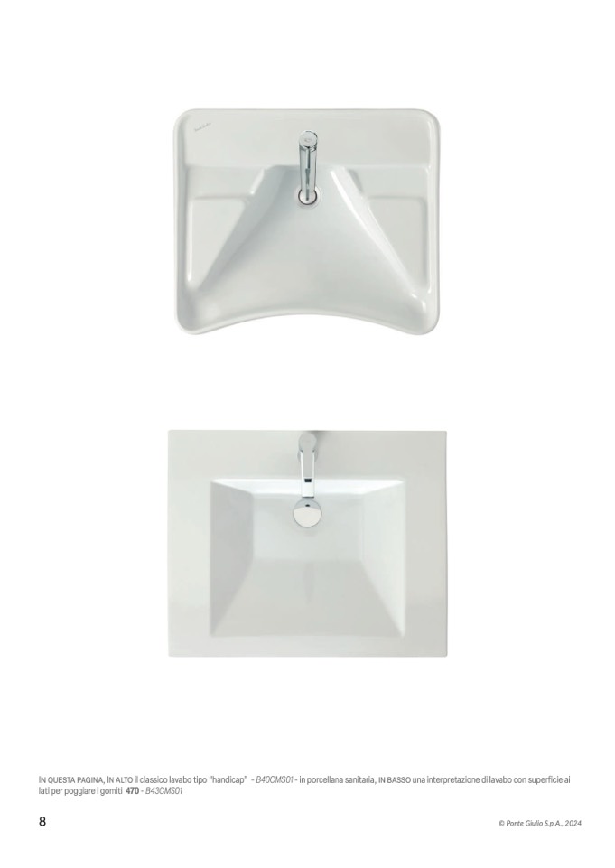 In questa pagina, In alto il classico lavabo tipo “handicap” - B40CMS01 - in porcellana sanitaria, in basso una interpretazione di lavabo con superficie ai