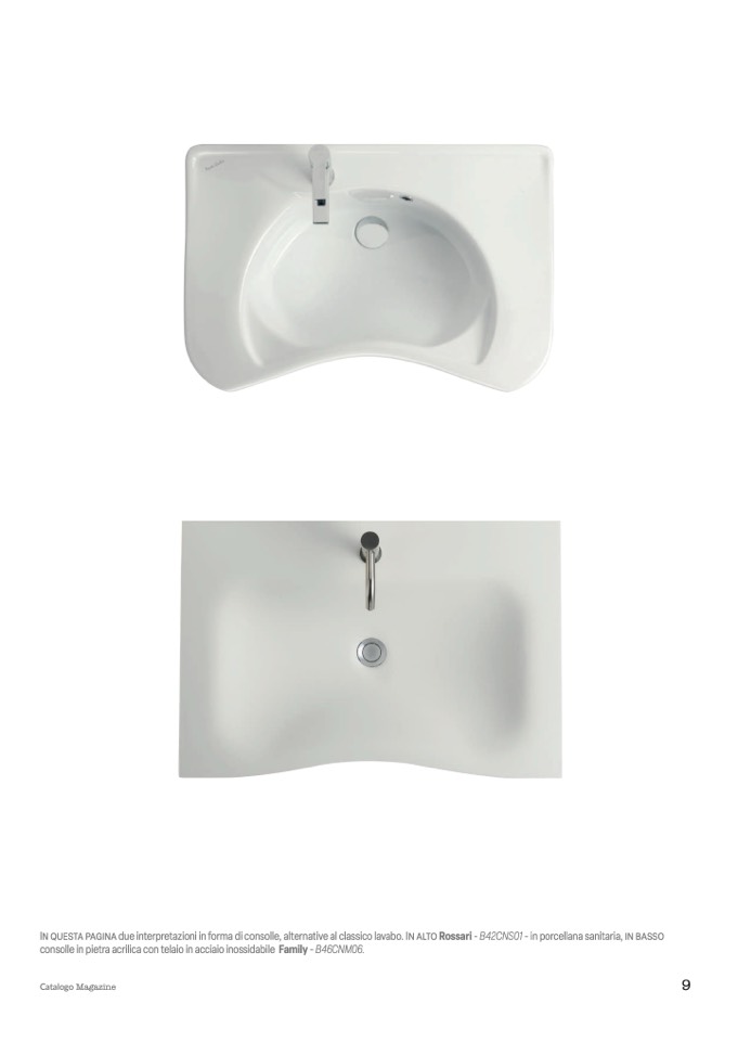 In questa pagina due interpretazioni in forma di consolle, alternative al classico lavabo. In alto Rossari - B42CNS01 - in porcellana sanitaria, in basso