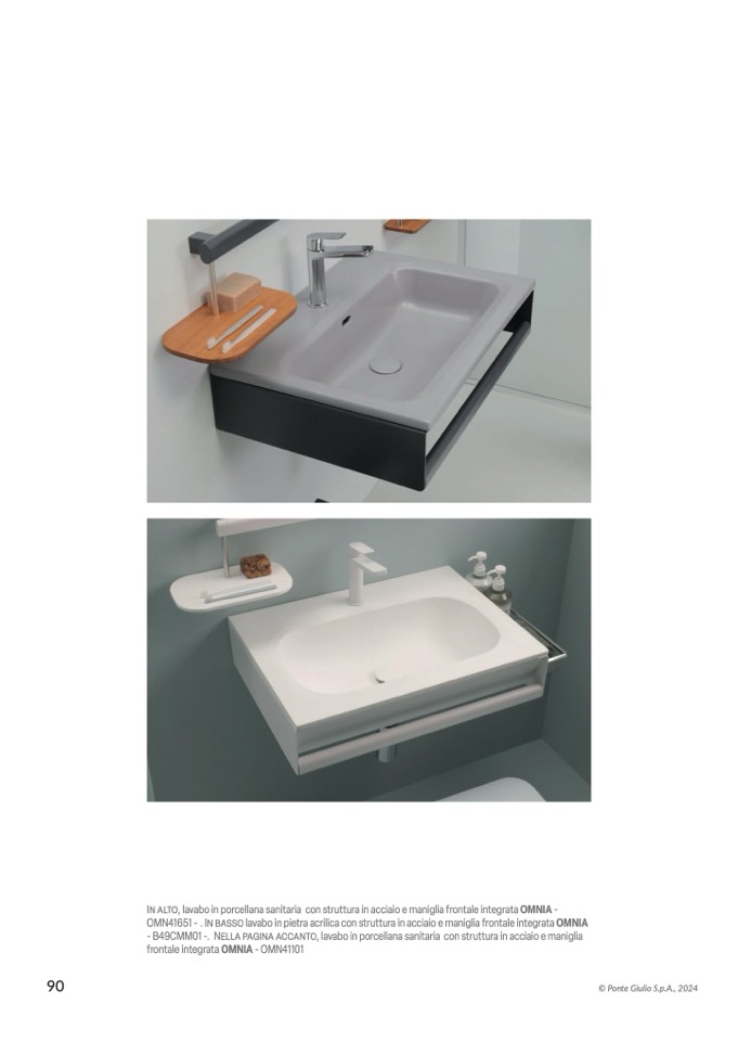 In alto, lavabo in porcellana sanitaria con struttura in acciaio e maniglia frontale integrata OMNIA -