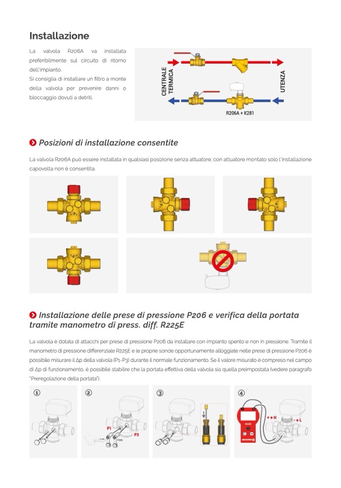 La valvola è dotata di attacchi per prese di pressione P206 da installare con impianto spento e non in pressione. Tramite il