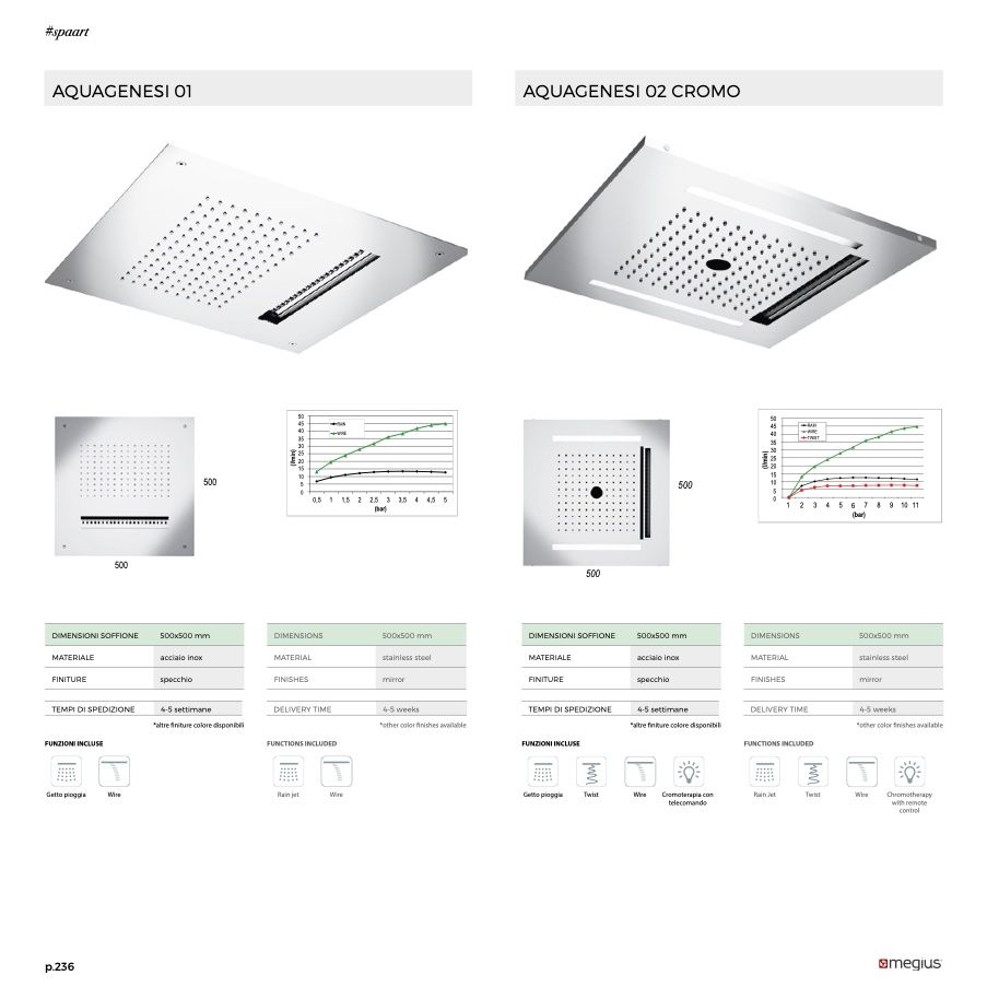 500×500, due funzioni con getti pioggia e wire, materiale inox