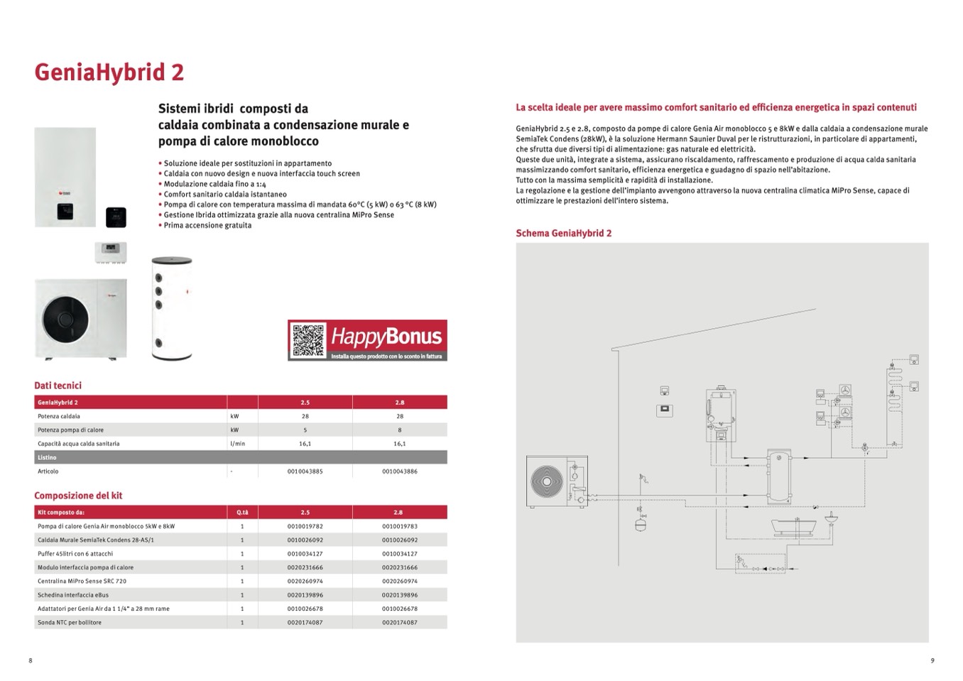 GeniaHybrid 2.5 e 2.8, composto da pompe di calore Genia Air monoblocco 5 e 8kW e dalla caldaia a condensazione murale