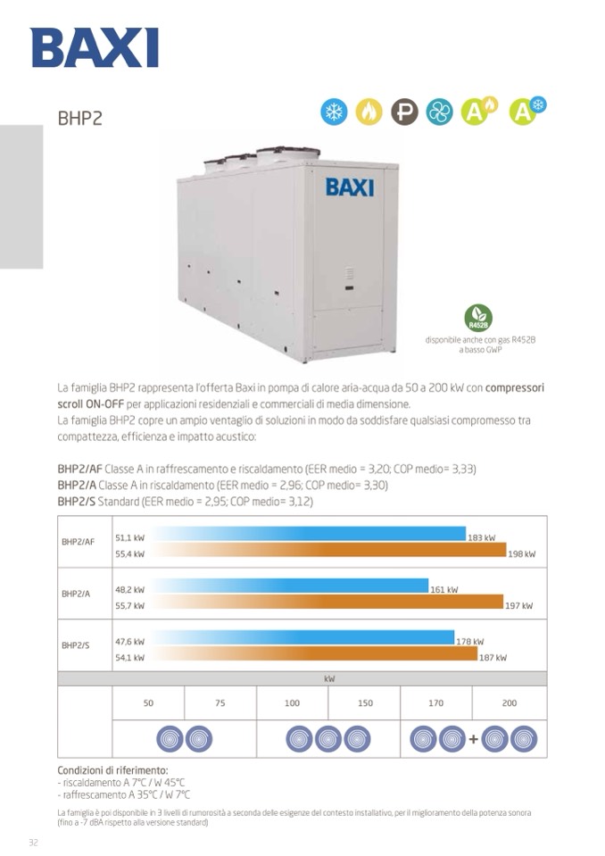 La famiglia BHP2 rappresenta l’offerta Baxi in pompa di calore aria-acqua da 50 a 200 kW con compressori