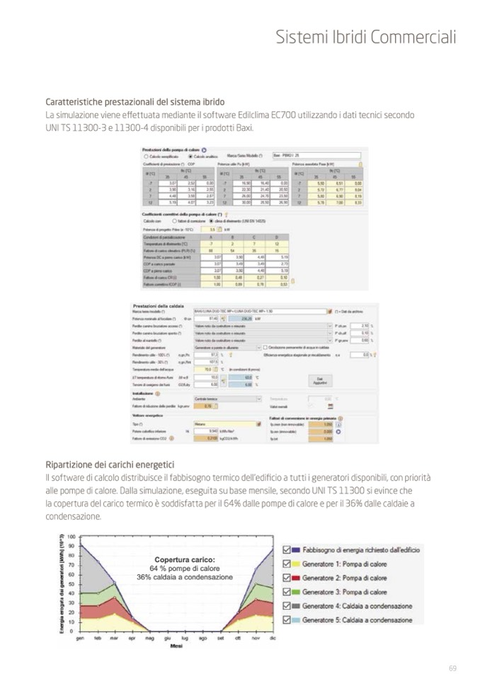 la copertura del carico termico è soddisfatta per il 64% dalle pompe di calore e per il 36% dalle caldaie a