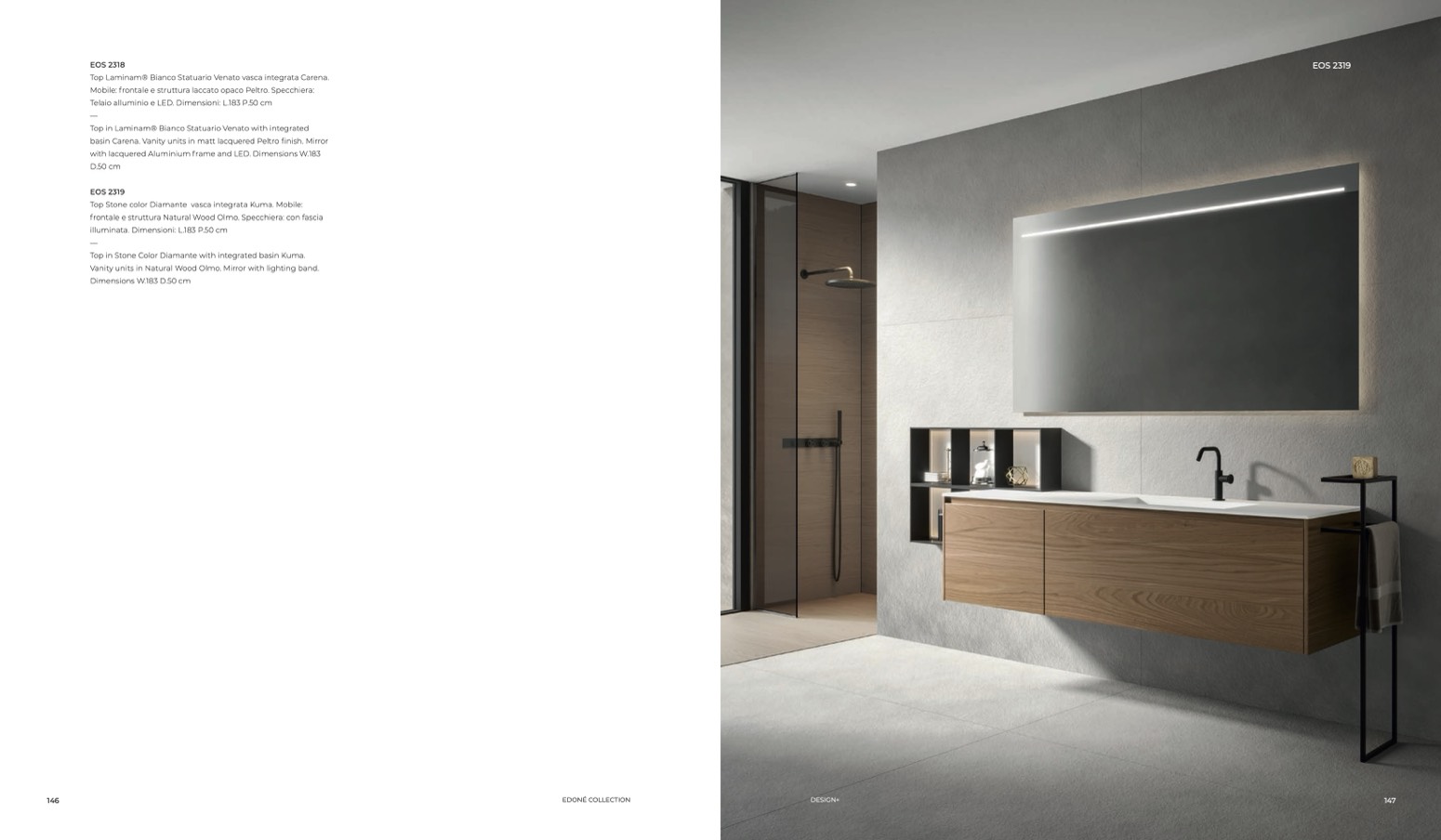 Vanity units in Natural Wood Olmo. Mirror with lighting band.