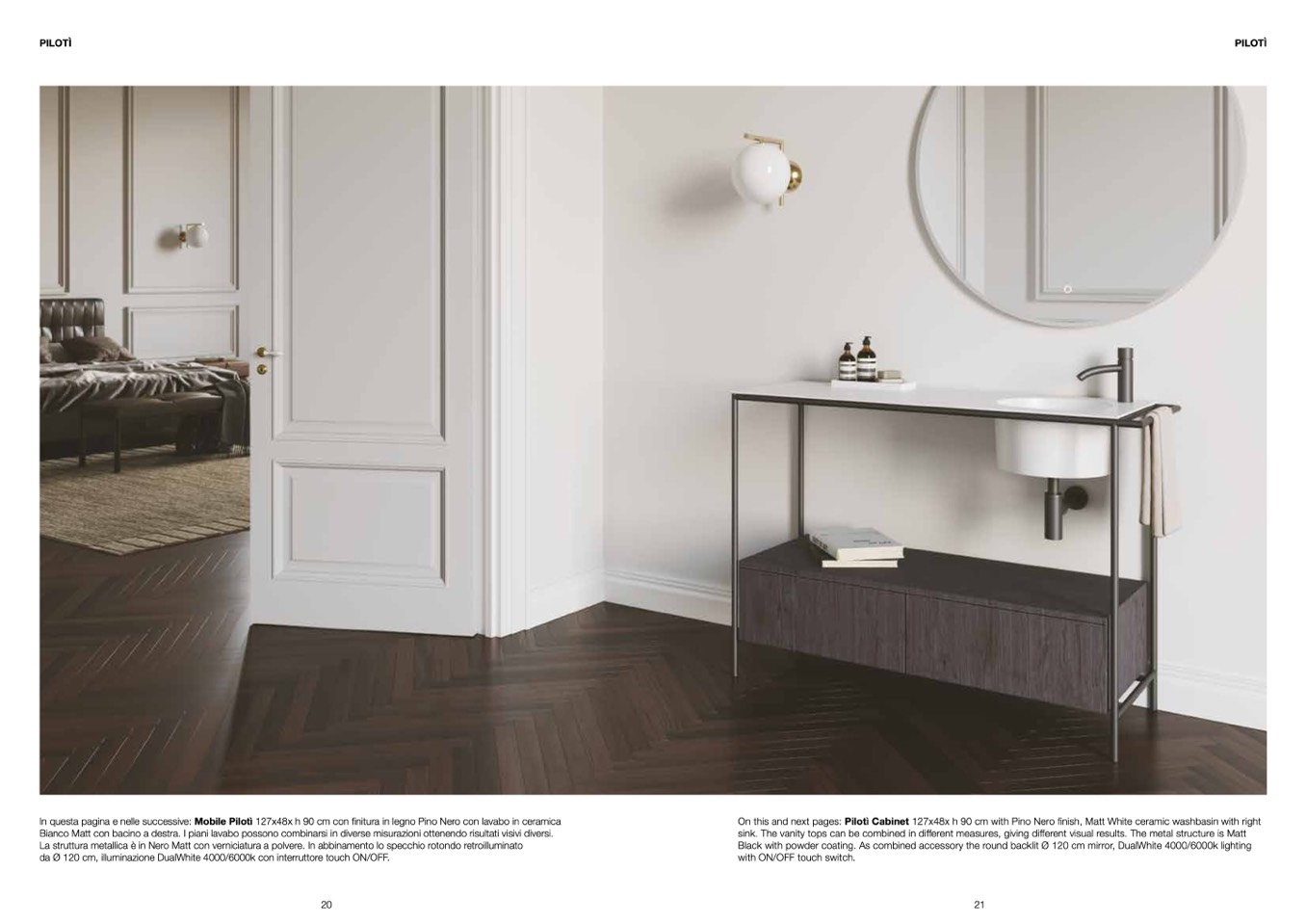On this and next pages: Pilotì Cabinet 127x48x h 90 cm with Pino Nero finish, Matt White ceramic washbasin with right