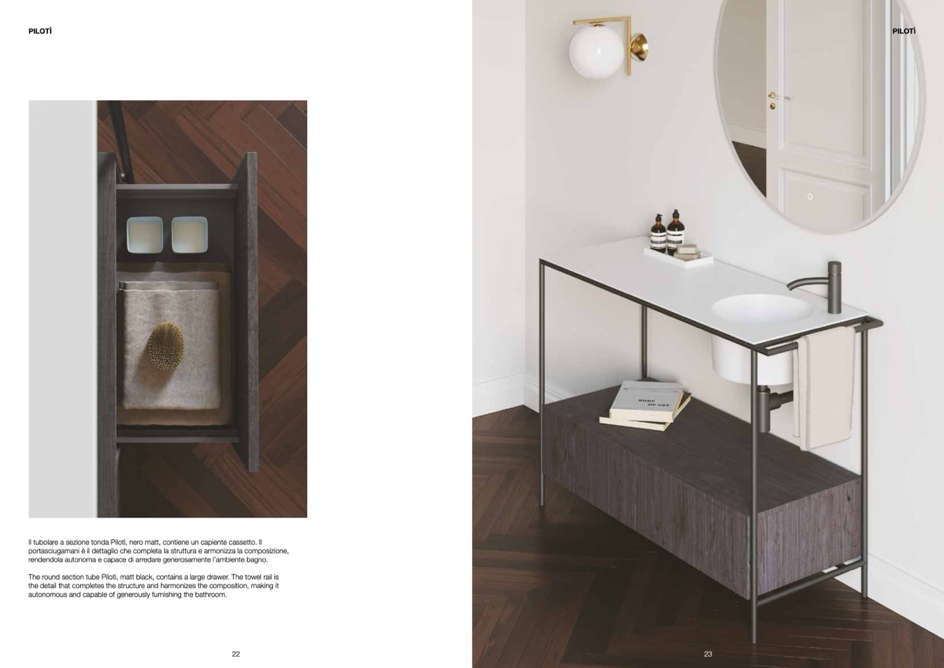 The round section tube Pilotì, matt black, contains a large drawer. The towel rail is