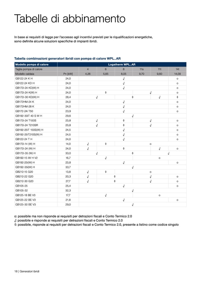 Tabella combinazioni generatori ibridi con pompa di calore WPL..AR