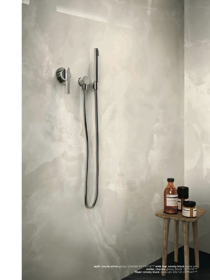 wall: cloudy white glossy 120x280 471/4”x1101/4” sink top: smoky black matte ptv