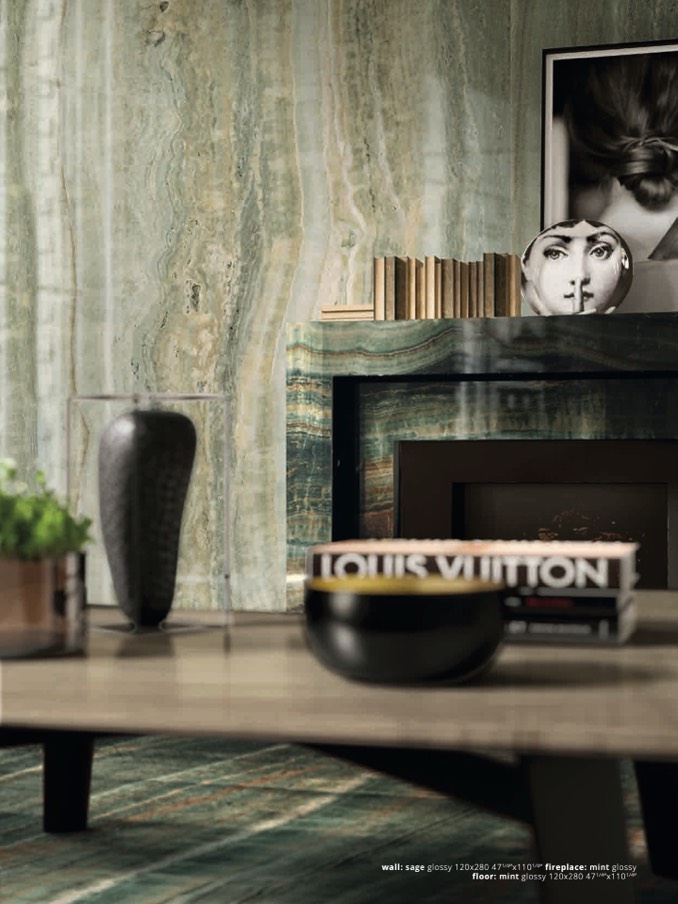 wall: sage glossy 120x280 471/4”x1101/4” fireplace: mint gloss