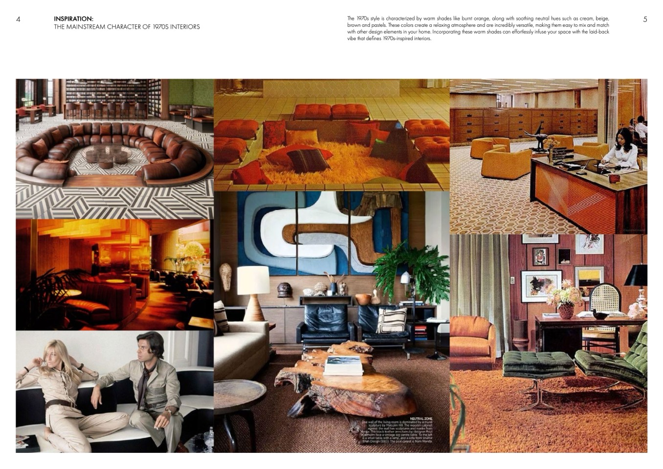 The 1970s style is characterized by warm shades like burnt orange, along with soothing neutral hues such as cream, beige,