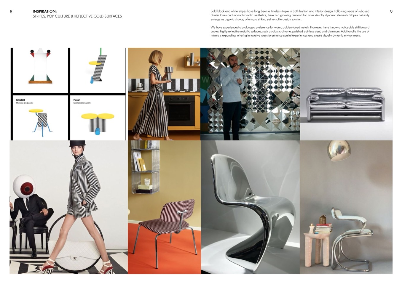 cooler, highly reflective metallic surfaces, such as classic chrome, polished stainless steel, and aluminum. Additionally, the use of