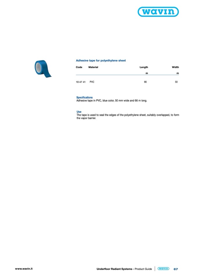 Adhesive tape in PVC, blue color, 50 mm wide and 66 m long.