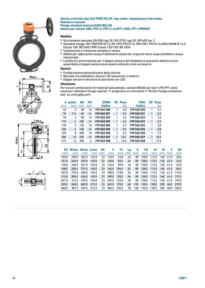 Valvola a farfalla tipo 565 PVDF/PA-GF, tipo wafer, installazione intermedia