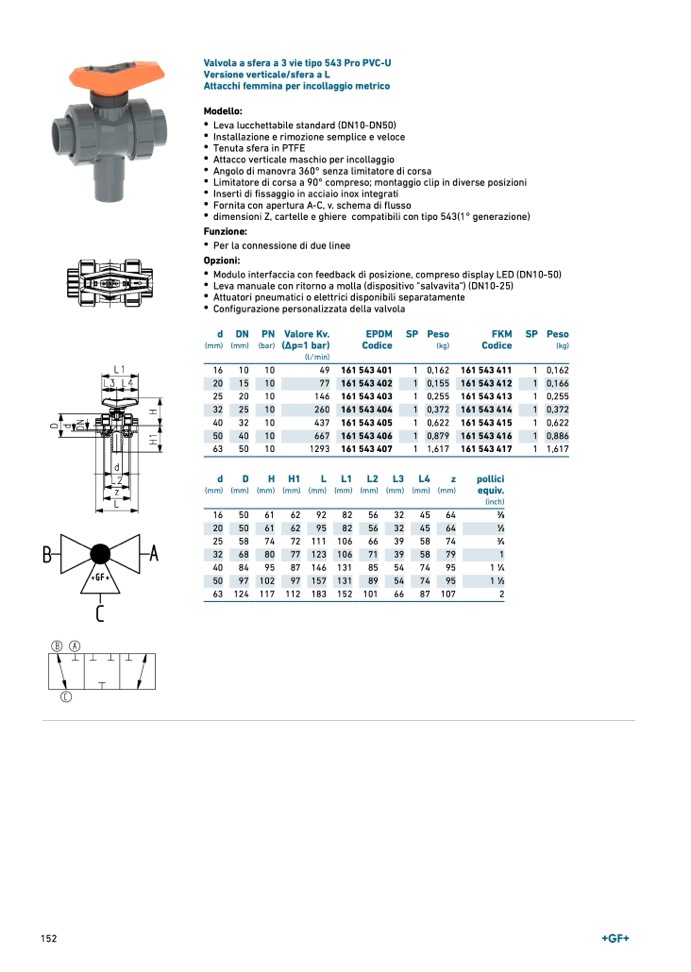 Valvola a sfera a 3 vie tipo 543 Pro PVC-