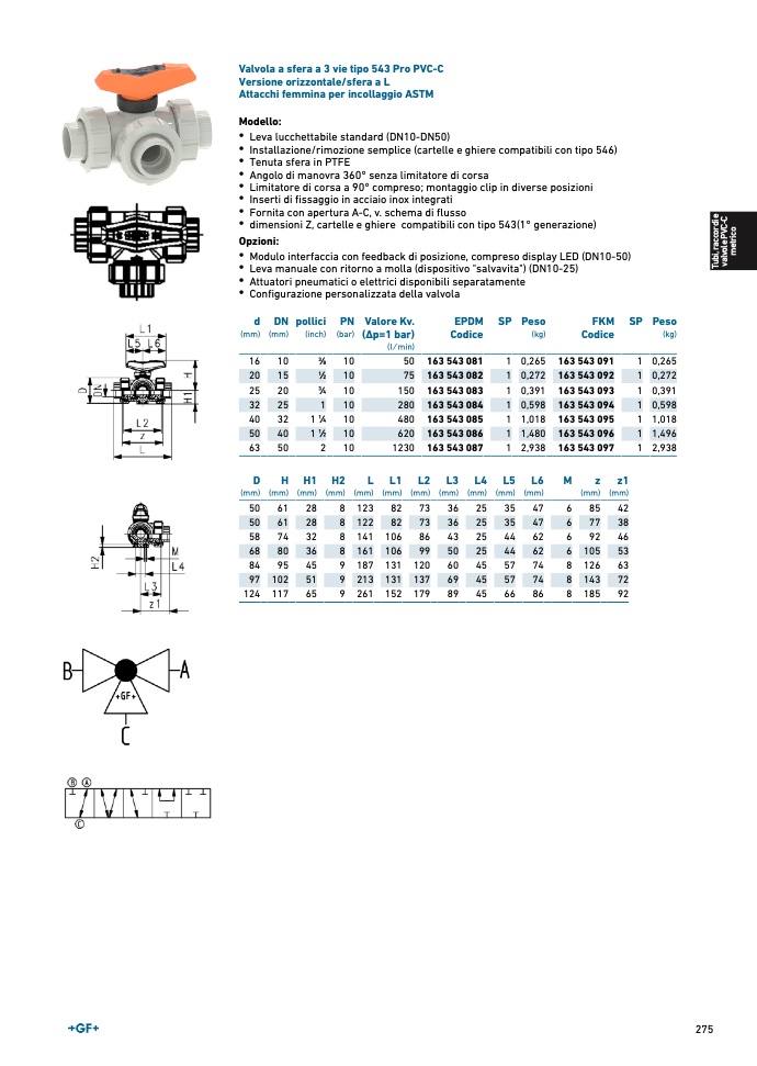 Valvola a sfera a 3 vie tipo 543 Pro PVC-