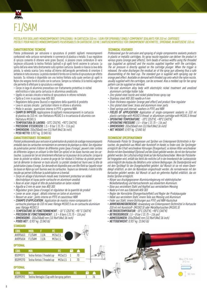 PISTOLET POUR MASTICS MONOCOMPOSANTS PULVERISABLES EN CARTOUCHE 310 ML | KARTUSCHENPISTOLE FÜR EINKOMPONENT-DICHTMITTEL, SPRÜHBAR, IN KARTUSCHE 310 ml.